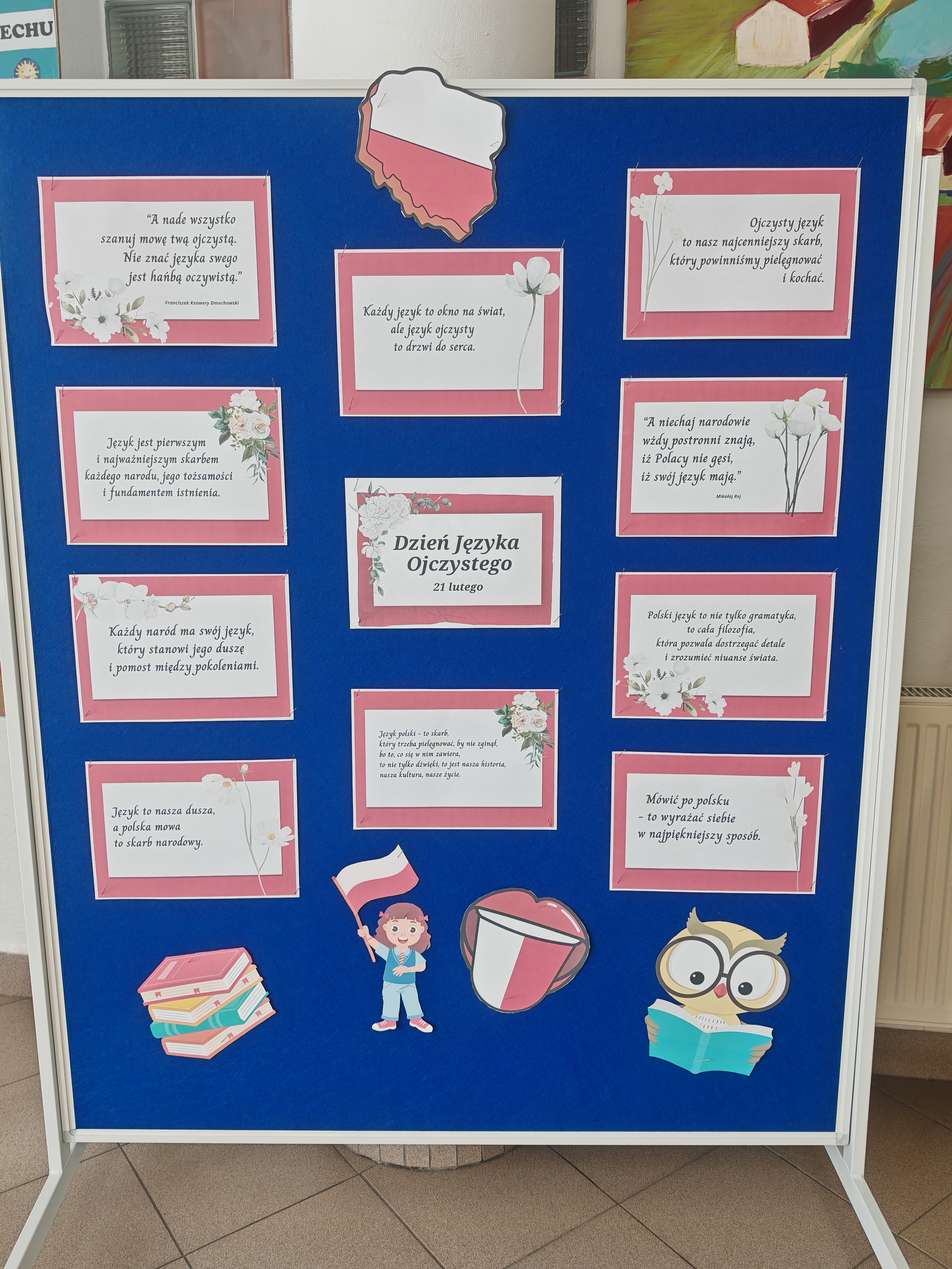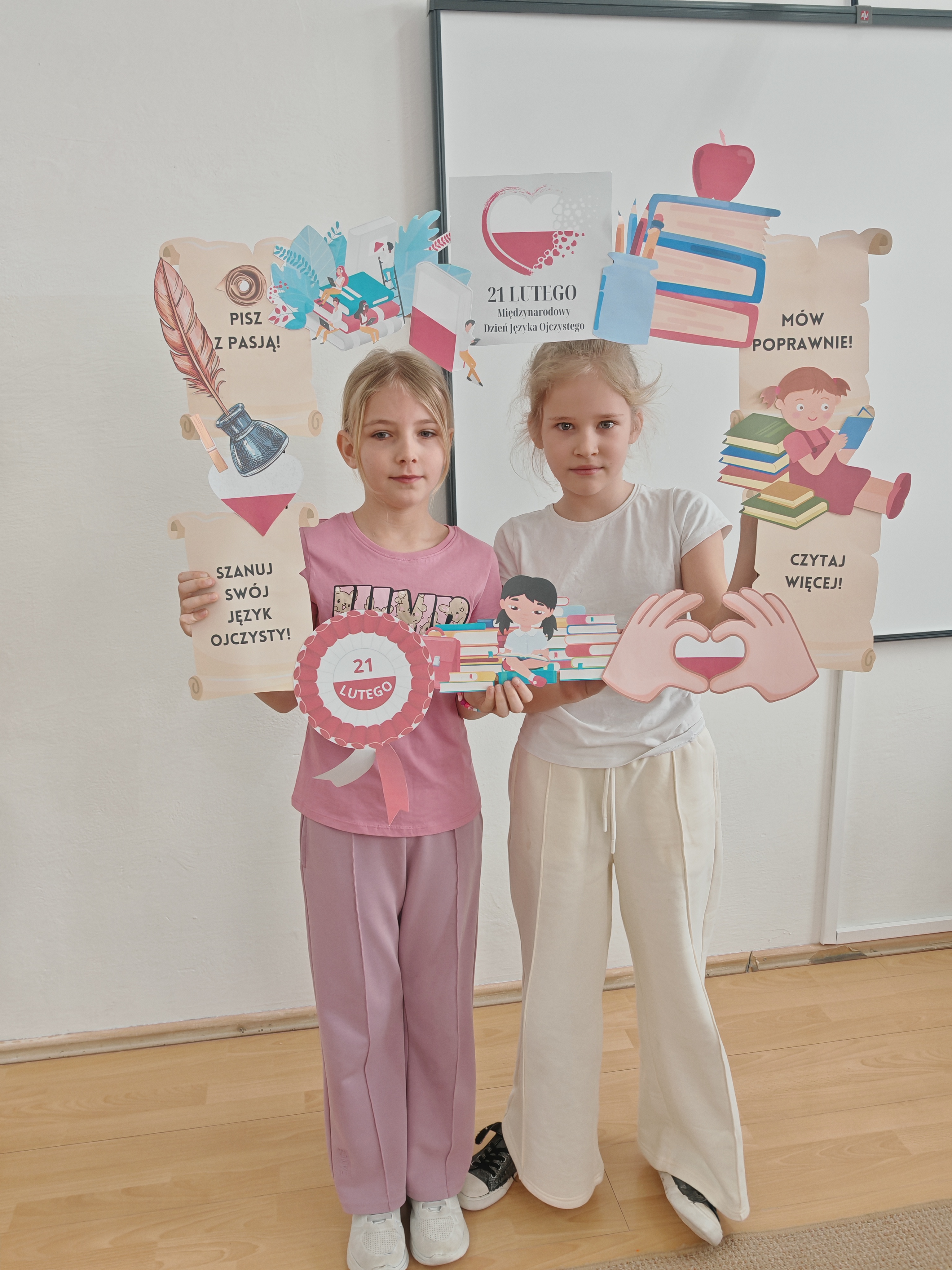 Szkolne korytarze ozdobiły tematyczne gazetki oraz zrywki językowe, a na schodach pojawiły się wyrazy z różnymi trudnościami. Dużym zainteresowaniem cieszyła się również ramka polonistyczna, przy której uczniowie robili pamiątkowe zdjęcia.