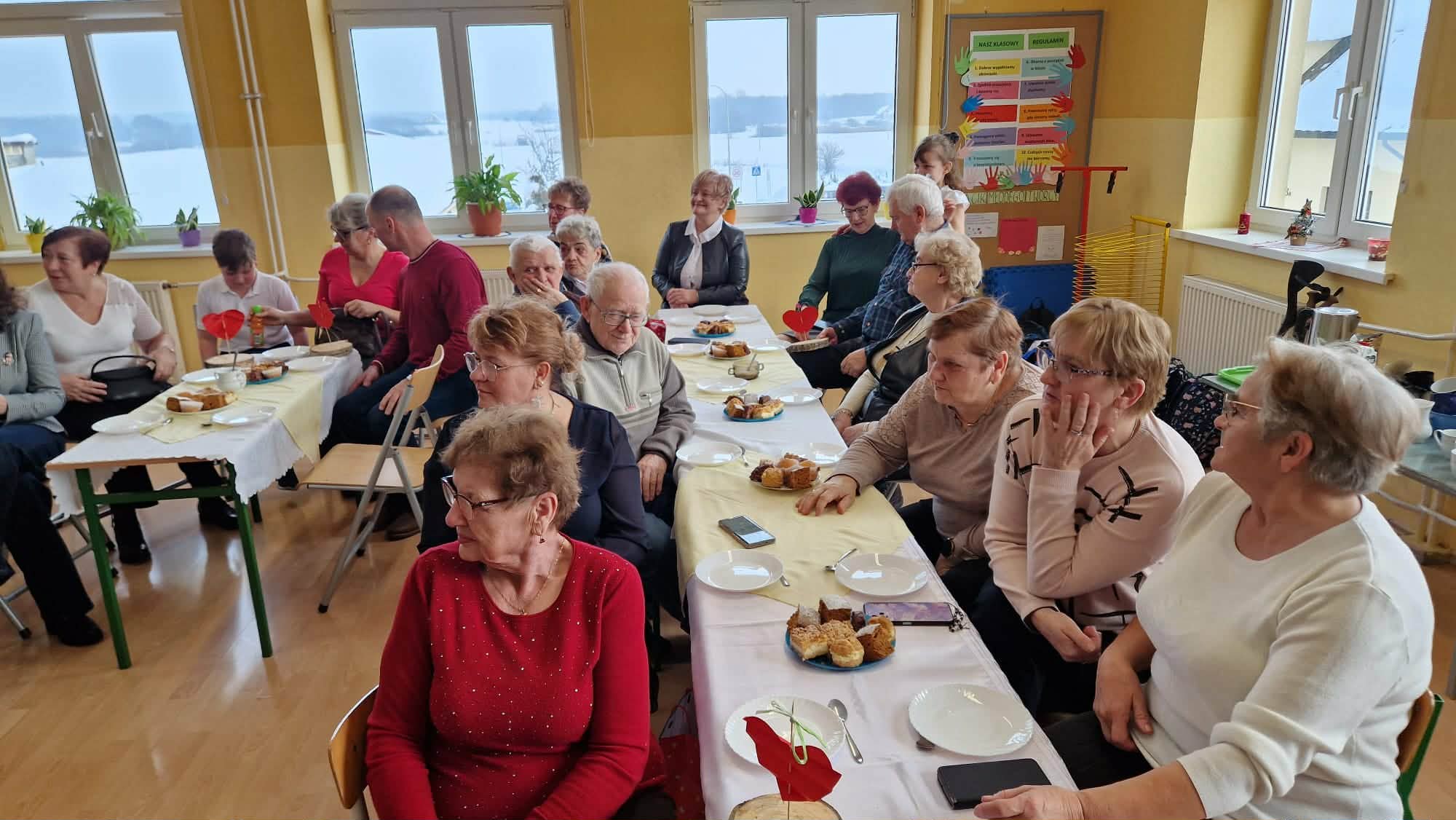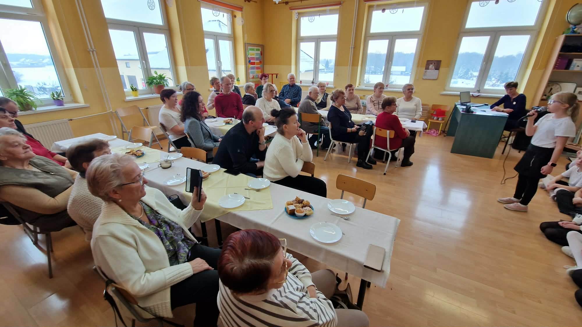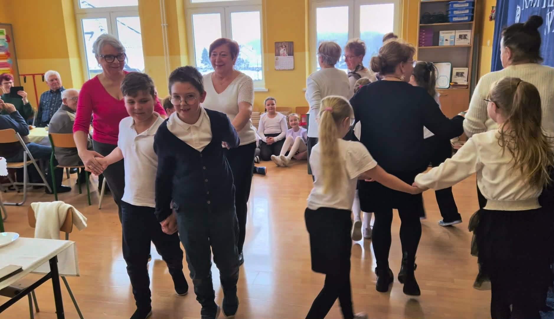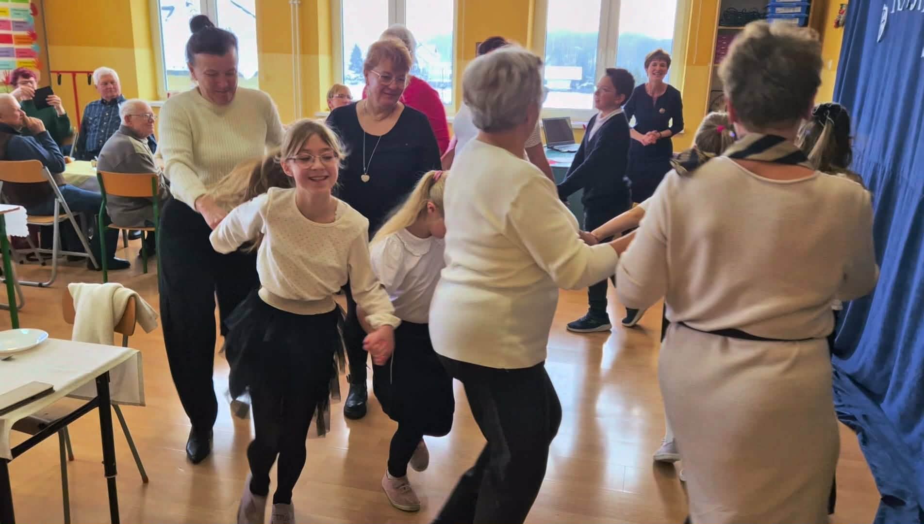 Klasa III miała zaszczyt gościć seniorów z gminy Rybno oraz swoich dziadków. Uczniowie rozpoczęli spotkanie świątecznymi utworami, które wprowadziły wszystkich w ciepły, radosny nastrój. Następnie, z okazji zbliżającego się Dnia Babci i Dziadka, poprzez piosenki, taniec i grę na dzwonkach wyrazili swoją wdzięczność, miłość oraz szacunek wobec seniorów. W kolejnej części zaprezentowali zabawę integracyjną „Konik”, która przywołała wspomnienia dawnych kuligów i zachęciła gości do wspólnej zabawy. Na zakończenie dzieci wręczyły upominki, a przy kawie, herbacie i cieście odbyły się rozmowy, wspomnienia pełne wzruszeń.
